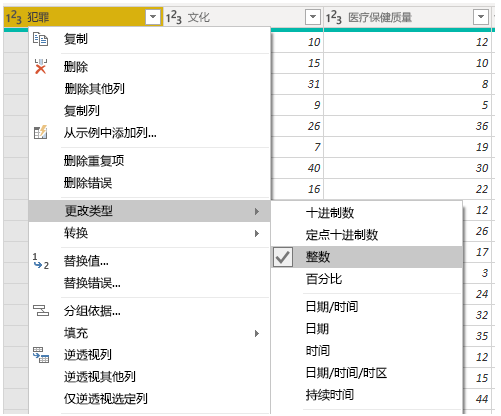 在中心窗格中,右键单击列将显示可用转换。可用转换的示例包括:从表中删除列、以新名称复制列或替换值。通过此菜单,还可以用常用分隔符将文本列拆分为多个列。