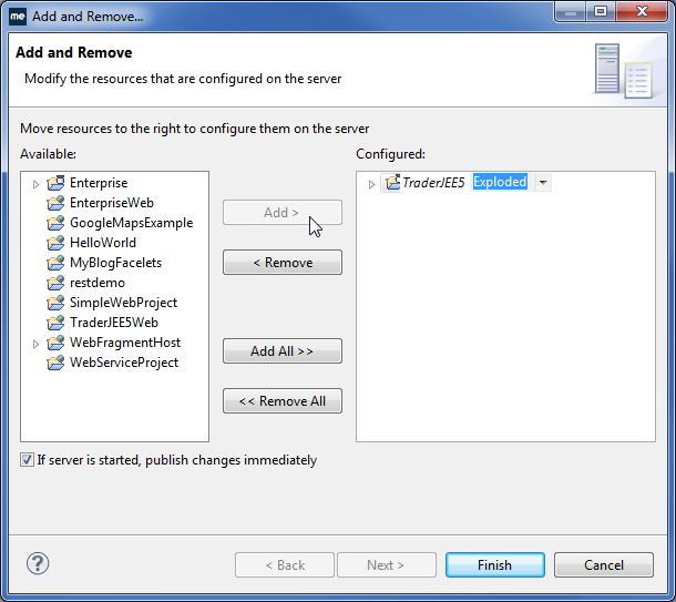 在“Available”列中选择TraderJEE5,然后单击“Add”。您可以使用已配置列中模块旁边的下拉列表来选择打包部署或展开部署,但若想实现最高效的开发过程建议采用展开部署。单击Finish。