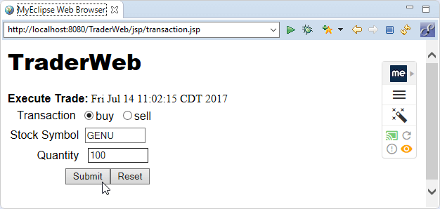 提交股票交易表单后,transaction.jsp将与Servlet交互,该Servlet使用名为Trader的无状态会话EJB启动交易。Trader EJB仅用于演示目的,并不与实际的交易服务进行交互。