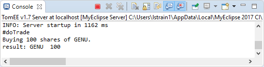 右键单击服务器,如果服务器未运行,则选择“Start”。启动服务器时,消息将流到Console视图。查看TraderJEE5已成功部署的消息。