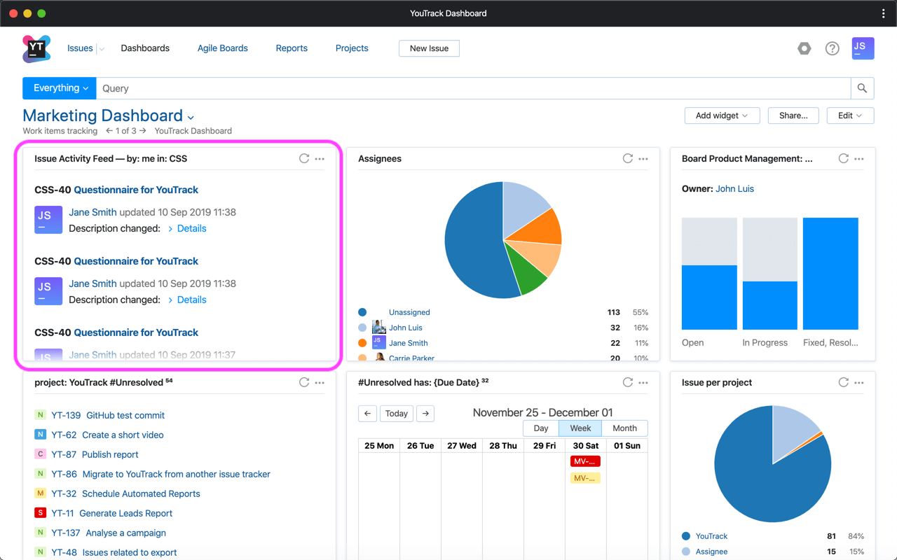 现在,您可以显示各种预定义事件类别的与问题相关的活动流。为仪表板配置小部件以跟踪不同项目中的更新或监视特定用户应用的更改。