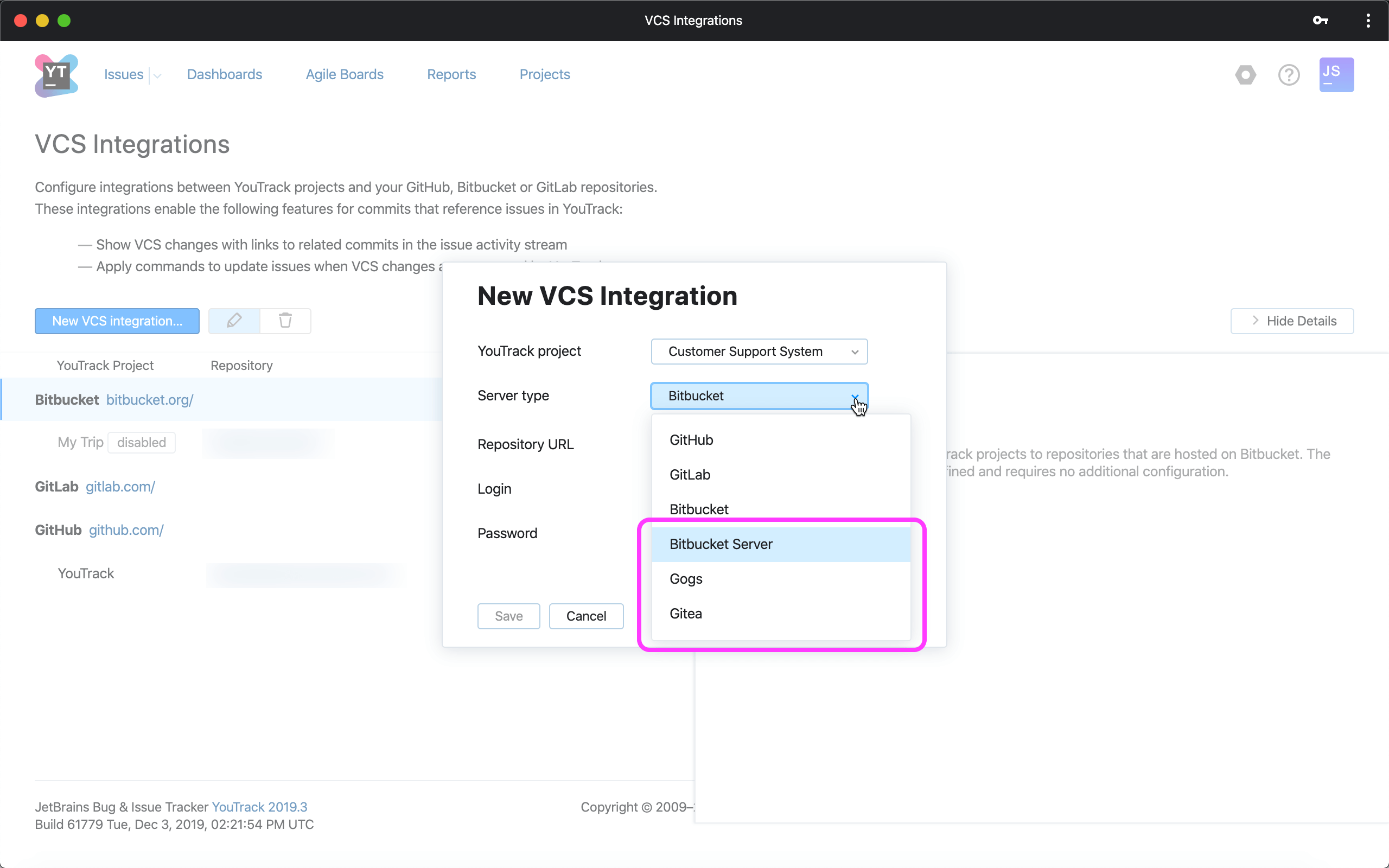 现在,您可以将YouTrack项目链接到Bitbucket Server,Gogs或Gitea安装中托管的存储库。