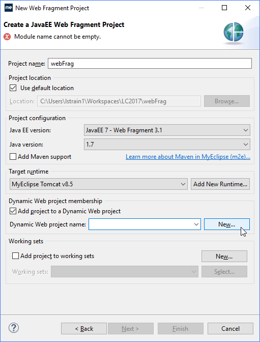 创建的Web片段将包含在新的动态Web应用程序中,该应用程序将与Web Fragment项目一起创建。