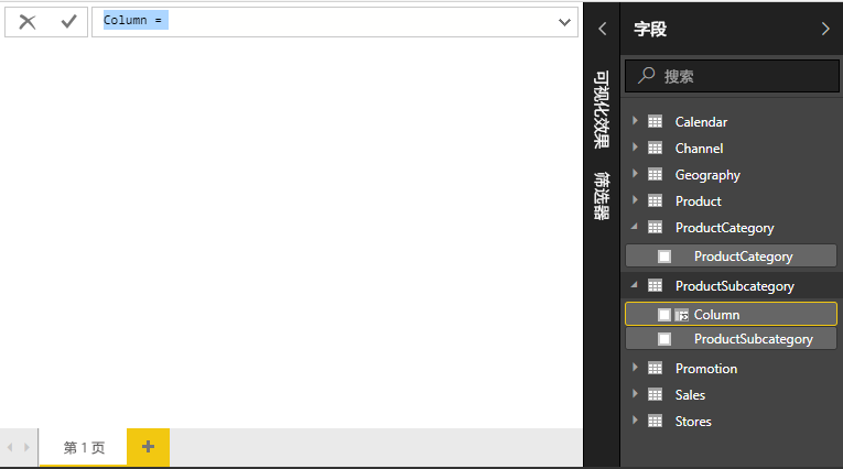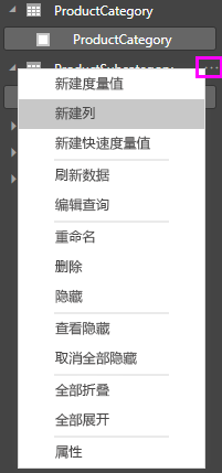 1、在“字段”列表中的“ProductSubcategory”表上,选择“更多选项”(…) 或单击右键,然后选择“新建列” 。这将在“ProductSubcategory”表中创建新列。