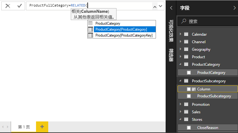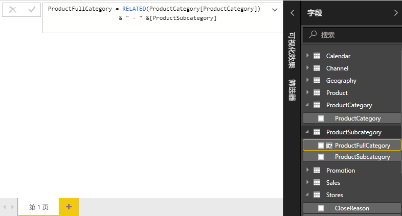 7、按Enter键或选择公式栏中的选中标记以完成该公式。该公式将生效,并且“ProductFullCategory”列名将出现在“字段”列表的“ProductSubcategory” 表中。