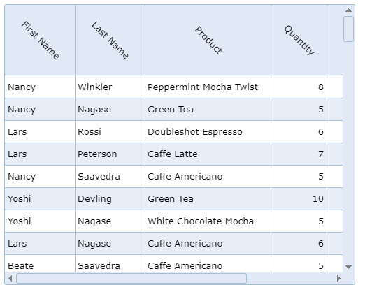 2、创建一个新的jqxGrid实例。Grid中的每一列都有一个'classname'属性,我们将其设置为一个名为'rotate'的自定义类。