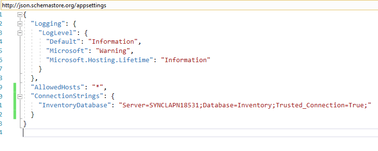 然后我们可以在应用程序启动期间注册数据库上下文服务(InventotyContext)。在以下代码中,从appsettings文件中读取连接字符串并将其传递给上下文服务。