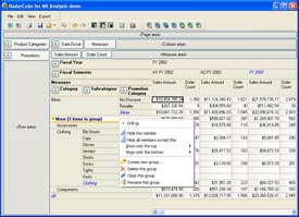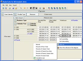 RadarCube is a constructor - a big and pretty complex toy. In RadarCube, you can tune everything. You can use it in the simplest mode of the flat hierarchies by disabling the features of grouping and filtering, and nothing will differ from the simplest OLAP components. You can intercept the dialog windows by replacing them with your own. You can intercept the procedures of the context menu generation, cell drawing in the grid or the hierarchy panels, use any font, paint them in any colors, and in general, output the things you need on the screen.