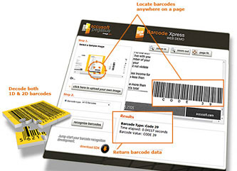 Detect, read, and write 1D and 2D barcodes. Barcode Xpress is designed to support document capture, indexing, archiving, and process automation applications. Available as both a .NET and ActiveX toolkit, it locates barcodes anywhere on a page, decodes barcodes, reports the content, reports recognition confidence values, and also writes barcodes.