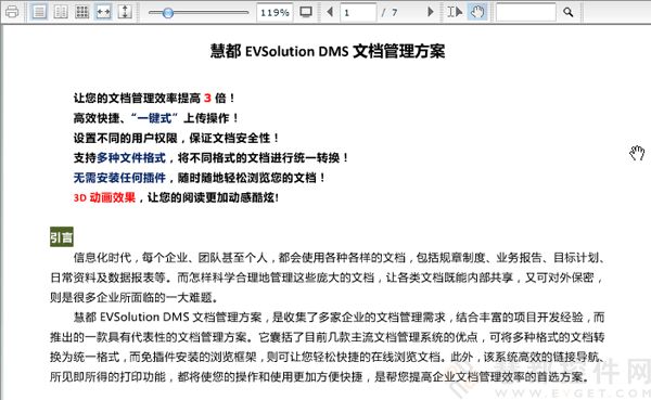 EvDMS文档在线浏览方案是慧都打造的一套高效、安全并具有丰富功能的文档在线转换及浏览方案。它不仅支持多格式文档转换,而且无需借助任何第三方插件,便可轻松实现文档在线浏览,高清显示文档,对文档的安全性进行全面保护,所见即所得的打印功能等,是帮您提高企业文档管理效率的首选产品!
