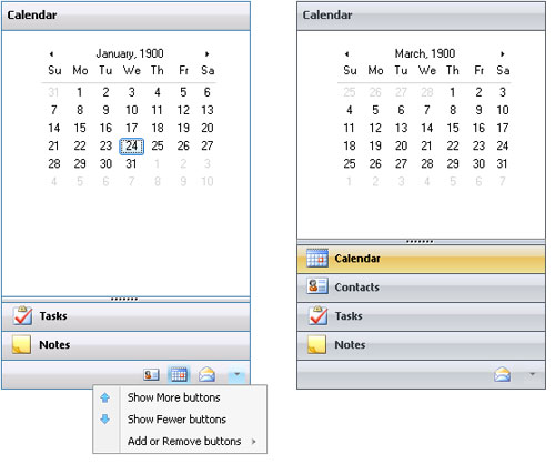 | Outlook风格的导航面板在功能上与Outlook 2010和2007导航条类似,其是创建Office风格用户界面的理想选择。VIblend Outlook风格的导航面板允许用户通过拖动柄分离器改变可见的群组数目。用户也可通过在底部显示的按钮面板查看隐藏的分组,还可通过点击处于导航面板底部右边角落里的箭头,使用内置的菜单对控件进行自定义。 | ||||||||||||||||||