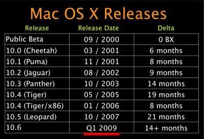 上月底苹果的UNIX技术团队主管Jordan Hubbard曾表示,雪豹将在2009年第一季度上市,因为苹果计划在一月份举办的Macworld世博会上展示一份几乎是定稿的副本,并会在接下来的一两个月内确定官方发布日期。