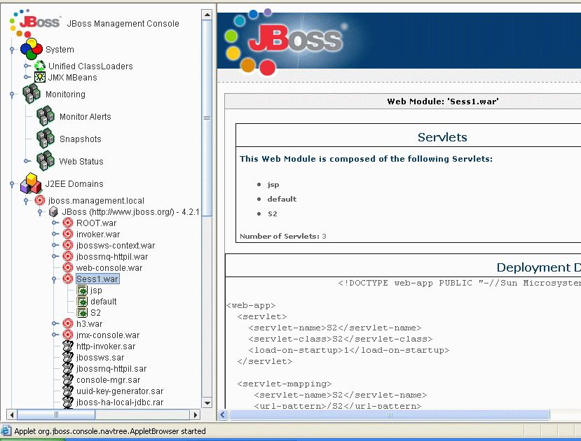 JBoss 4.2有非常漂亮的Web管理控制台,但它所提供的管理功能及特性与Geronimo不尽相同。首先看到的是JBoss的状态及其监测信息,但并没有提供 部署功能。而部署Java应用时,只需要将它复制到default/deploy文件夹下面,JBoss会自动的检测到它并进行相关的快速部署。当然,也 可以通过修改配置jboss-service.xml来进行客户应用程序所在目录的映射。