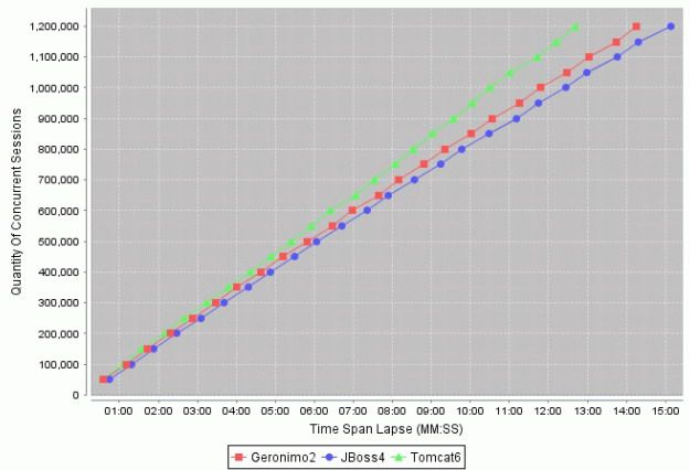 就可靠性而言,性能应该是所以的应用服务器所应该提供的最重要的特性。在本 文中,笔者做了一个小实验,使用JSP页面及编译好的servlet来测试应用服务器所能处理的用户会话个数以及所能连接的用户数量。当然,实际的 Java应用是更加复杂的,而本实验中的JSP页面及servlet是比较简单的,主要用于测试Web应用服务器的稳定性、可靠性及速度。