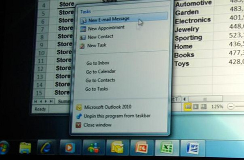 就像Office 2007对Vista特别优化一样,Office 2010已经针对Windows 7的跳转清单功能进行了优化,任务栏上提供了Office相关办公组件的主要功能,例如Outlook的电子邮件,日历,联系人和任务,只要拖动文件到窗格中,就会自动以文件作为附件,任务栏还会显示新电子邮件的信息一起来看图: