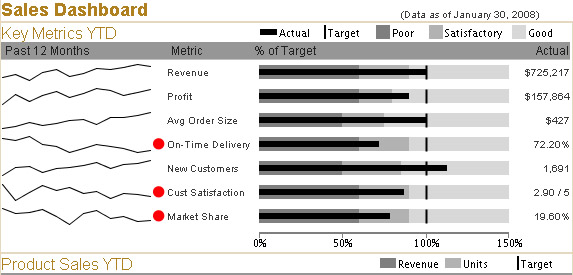 Dashboard它首先是一种理念和解决方式。传统的报表源自纸张上的打印生成。虽然报表的制作早已从手工的绘制变成了电脑软件的生成,但报表的设计和应用在很多方面还保留了纸面输出的特点。Dashboard是一个突破纸张限制的界面。在一定程度上,我们可以说Dashboard是一种只存在于电脑里的报表。在思维上,Dashboard撇弃了最终输出必须是打印的限制,进而可以充分应用电脑的互动的功能来最优的显示和传输信息。