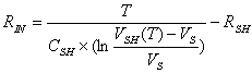 其中,RIN为输入模拟信号内阻,VS为输入模拟电压信号,RSH为模拟多路开关与采样开关的等效电阻,VSH为采样电容的充电电压,由等效电路可以看出,输入模拟信号内阻越大,则采样电容充电时间越长,因此,对于采样频率要求越高的场合,要求模拟输入信号内阻必须越小,在应用时必须首先估算在规定的采样频率下,对模拟输入信号内阻的要求。由电路理论可以求得RIN所允许的最大值(假设采样时间为T):