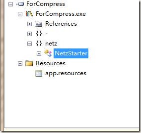 对比图9-19和图9-20,我们发现名称空间ForCompress变成了netz,类Progress变成了NetzStartter。程序集多多了个资源文件app.resources。下面我们展开NetzStartter类,来查看其下的方法。如图9-21所示。