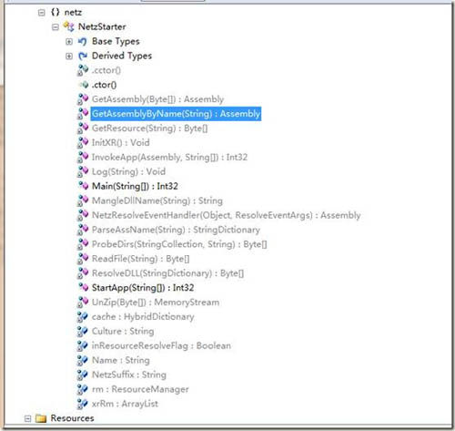 Main方法中的AppDomain.CurrentDomain.AssemblyResolve += new ResolveEventHandler(NetzStarter.NetzResolveEventHandler)一句代码也无需多言,只是指定程序集解析失败时的事件处理。