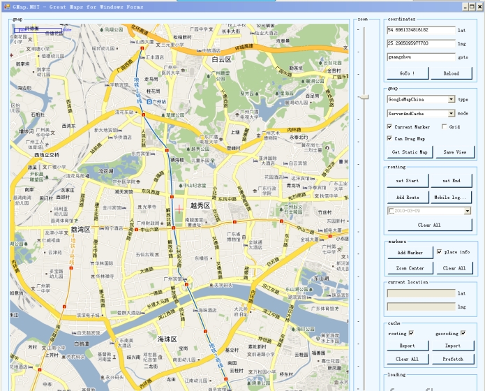 这个控件默认使用了右键按住作为拖动,和GoogleMap用鼠标左键作为拖动有点不太一样(不过可以通过this.gMapControl1.DragButton = MouseButtons.Left;来实现左键拖动),两者皆能够支持滚轮放大缩小的操作。控件还支持经纬度的精确定位,绘制图标(支持绿色、红色的图标、十字符号等标记),支持中心点移动 ,导出地图图片等功能。由于地图控件支持路线的绘制,所以应该支持一般的GIS应用中的轨迹回放功能的。由于地图控件支持鼠标位置和经纬度坐标的转换功能,因此,可以随意获取到相关的经纬度信息。