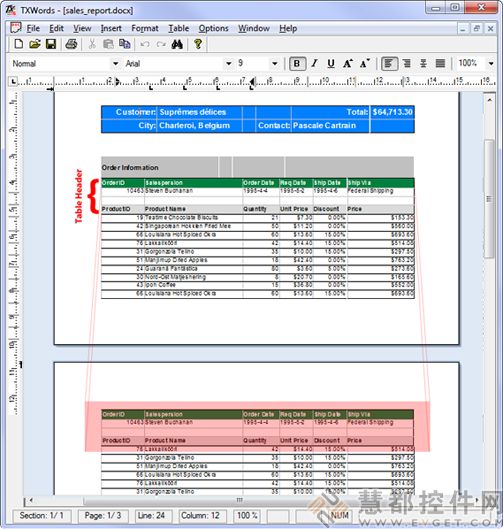 在任何一个页面,由于表的最大长度就是该页面的最大长度(减去边距,页眉和页脚),因此在分页时很有必要进行分表。有了TX Text Control ActiveX 16.0,当进行分页时,表中的任何一行都可以自动添加到表的顶端。有了这项新的特征,无论表有多长,都可确保了每一页的表上都有表头。表头可包含任何格式,文字或者表中其他单元格可用的图片。因此,你就可以在整个长表的左上角添加公司LOGO,而在每一分页的表头上添加大量的文字信息。