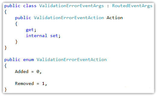BindingValidationError事件定义在FrameworkElement中,通过它可以接收到ValidationErrorEventArgs类型的参数,而在ValidationErrorEventArgs中定义了一个很重要的属性Action,它的定义如下: