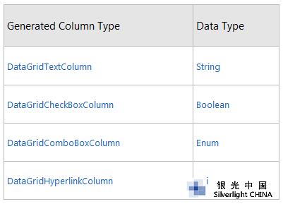 默认情况下,当我们为DataGrid 控件设置ItemSource 属性后,DataGrid 会根据数据类型自动生成相应的列,下表列出DataGrid 支持的四种列及其数据类型。