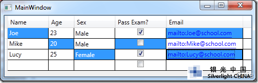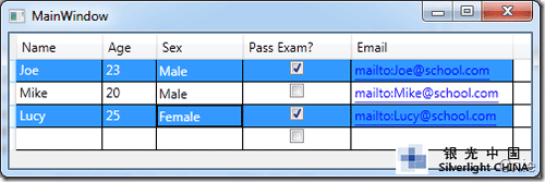 默认情况下,DataGrid 的选择模式为“全行选择”,并且可以同时选择多行(如下图所示),我们可以通过SelectionMode 和SelectionUnit 属性来修改DataGrid 的选择模式。