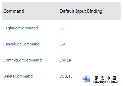 默认情况下,我们可以直接在DataGrid 中编辑数据(下表为相关的编辑命令),当然也可以通过IsReadOnly 属性将DataGrid 设置为只读方式。