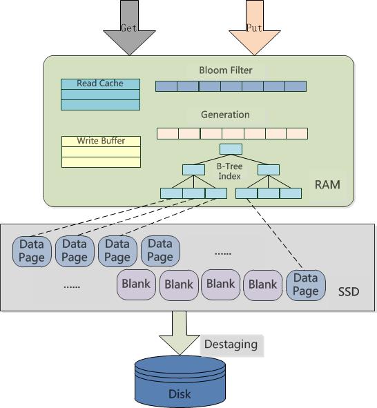 插入的时候,先写到write buffer里面,当buffer到达一个临界值的时候将其刷到SSD上,当SSD到达一个临界值的时候,将其踢出并移到硬盘,当然整个过程Bloom Filter也要保持一致。
