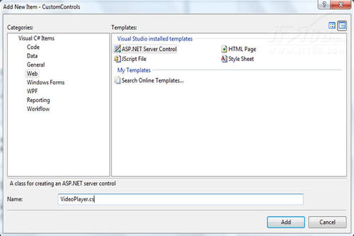 在资源管理器中,右键点CustomControls工程,选择“Add New Item”,再在弹出的菜单中选择Web的分类目录,然后在模版中选择ASP.NET Server Control选项,如下图: