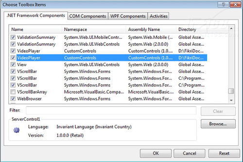 2) 在弹出的菜单中选择.NET 组件卡,并选择浏览,浏览我们刚做好的CustomerControll工程中的bin\debug目录下的CustomControls.DLL,最后点确定,如下图所示:
