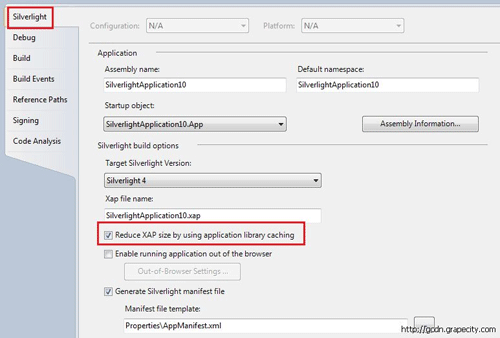 1. SilverlighApplication10工程属性里”Silverlight”标签下勾上 “Reduce XAP size by using application library caching”