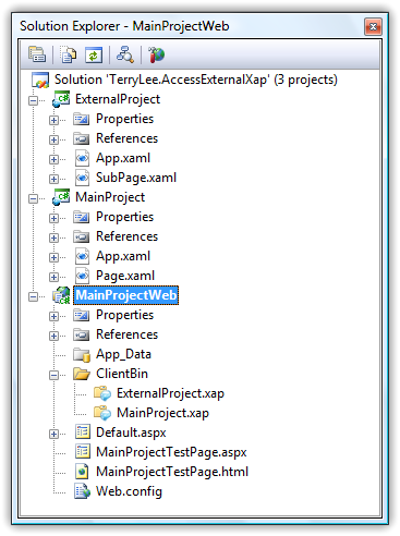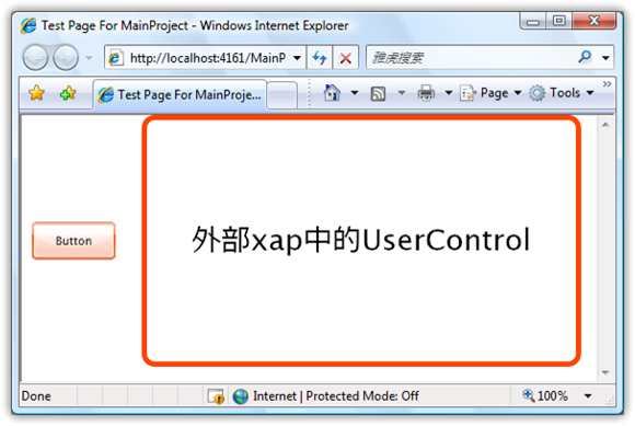这样在编译后,将会在ClientBin文件夹下产生两个.xap文件,现在我们将在MainProject.xap文件中访问ExternalProject.xap中的UserControl。