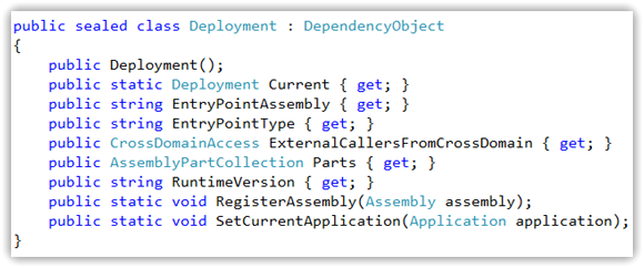 有了AppManifest.xaml中内容,就可以根据它来构造一个Deployment对象,Deployment对象提供了当前应用程序的Part和本地化信息清单,它的定义如下所示:
