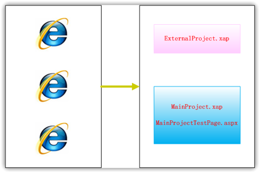 现在我们先来看一下需求,大致是这样子的,在服务端我们有两个xap文件,其中MainProject.xap文件将会在MainProjectTestPage.aspx中引用,而ExternalProject.xap文件中的UserControl将会在MainProject.xap文件中访问,并进行显示,如下图所示: