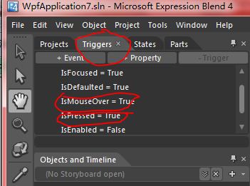 8.接下来给按钮添加MouseOver放大效果,Pressed缩小效果,选择图9中的Triggers,然后选择IsMouseOver=True