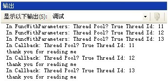 注意FuncWithParameter函数被连续执行了3次,它们依次被执行在相互独立的线程上,并且这些线程来自于线程池。而他们各自的回调函数也执行在与FuncWithParameter相同的线程中。线程11执行了FuncWithParameter,3秒后,它的回调函数也执行在线程11中,线程12、13也是同样。这样,我们可以认为回调函数实际上是异步函数的一种延续。