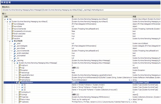 如果我们在编译器运行期间监视tag的状态,就会发现,AsyncResult对象下包含类型为System.Runtime.Remoting.Messaging.ReturnMessage的对象。点开它,就会发现这个标签中包含的所有的异步函数的执行信息!