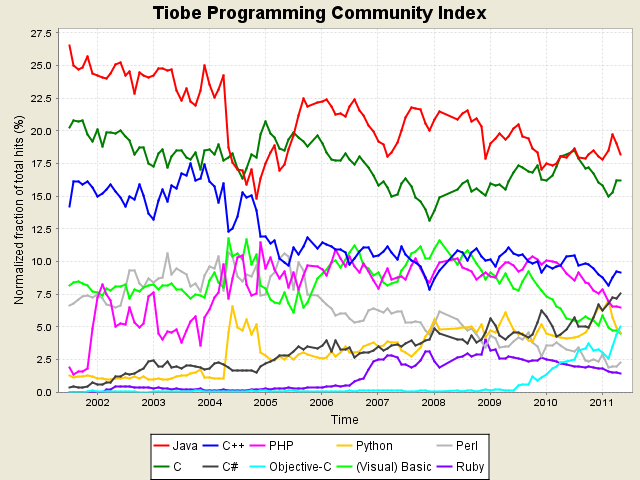 本月没有戏剧性的变化。C#和Objective-C中取得新的历史高点。没有任何其他的编程语言,可以达到C#和Objective-C的超过2.5%年升幅。Lua和Python分别提升了0.61%和0.49%。