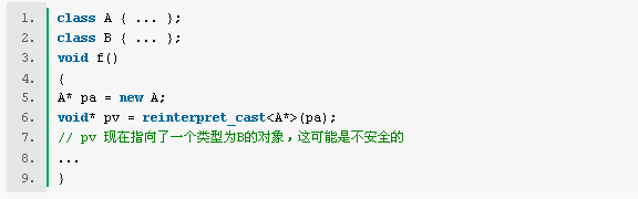 表达式reinterpret_cast<T*>(a)能够用于诸如char* 到 int*,或者One_class* 到 Unrelated_class*等类似这样的转换,因此可能是不安全的。