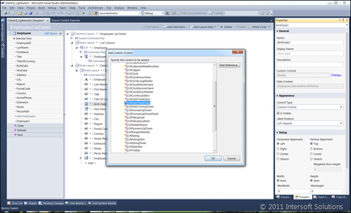 设计器一旦打开,便可选择其中一个日期时间段。自从“Hire Date”采用了日期和时间这两个元素,“Hire Date”似乎显得非常具有意思。在属性窗口中,将控件类型改为自定义控件,然后点击更改链接来指定自定义控件类型。接下来,会有一个对话框提示你,要求你选择要使用的控件类型。