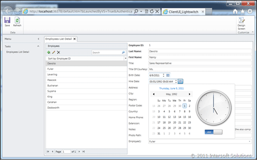 在本篇文章中,我将展示ClientUI’s UXDateTimePicker如何取代默认的日期和时间选择器,以提供更具吸引力的日期和时间选择。假设你已经准备好了一个简单的LightSwitch项目,此时,请打开屏幕设计器。在我的示例中,我采用员工详情列表,其数据来源于Northwind数据库。