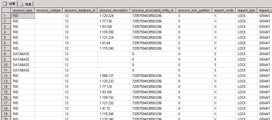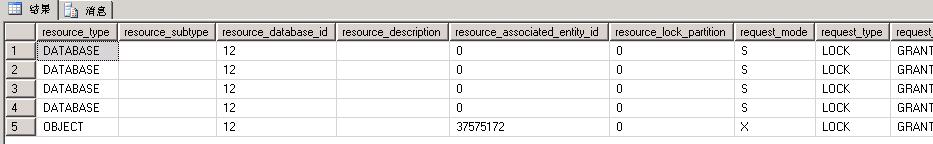 从上图中看出这个快照中有:三个数据库共享锁、一个页级意向排他锁、一个表级意向排他锁、两个行级排他锁。