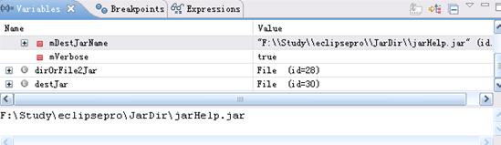 在Debug   视图的 Variables 小窗口中,我们可以看到 mDestJarName 变量的值为 "   F:\Study\eclipsepro\JarDir\jarHelp.jar "