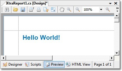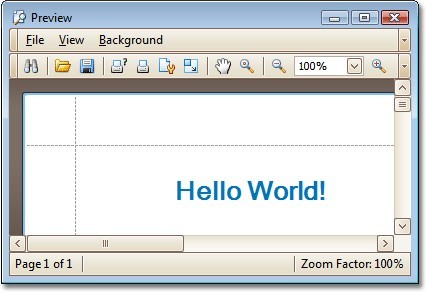 运行此应用程序。 单击 Preview 按钮调用 预览窗口,其中包含了所创建的 Hello World! 报表。 要 打印 报表,只需要单击 Print 按钮