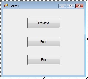 现在切换到 Form1 的设计器,并且在窗体中添加三个 System.Windows.Forms.Button 控件。 分别把它们的文本修改为 Preview、Print 和 Edit。
