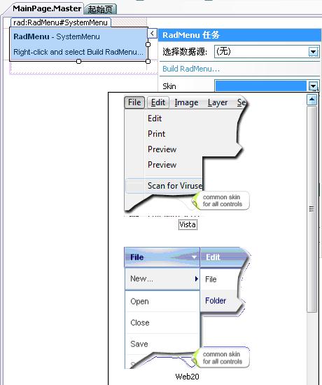 通过上面一步步的开发,现在终于可以一览RadMenu的风采了。通过上面建立的母版页建立一内容页,直接运行内容页就可以看到效果了。示例中我使用了三种皮肤:Web2.0,WebBlue和Vista,下面是此三种皮肤的运行截图: