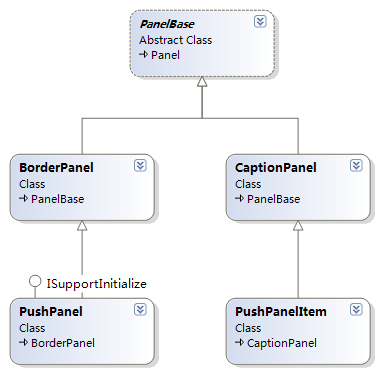 4、 PushPanel继承BorderPanel,是最终的抽屉控件,实现了可视化的添加和移除抽屉项(Item)、设置抽屉项的外观和展开、折叠抽屉项等功能。