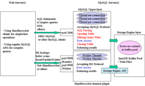 去年在twitter上看到HandlerSocket的出现,并宣称性能是Memcached的两倍时,非常令人吃惊,居然可以达到 750000qps。接着HandlerSocket成为NoSQL领域谈论的焦点之一, 大量的人开始想要尝试,并做过一些自己的性能测试。 下图是HandlerSocket的结构图: